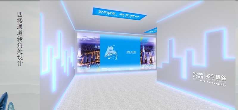 美湖展覽設(shè)計(jì)公司參與了南京蘇寧慧谷甲級(jí)寫字樓樣板房樓道的展廳設(shè)計(jì),通過藍(lán)色和白色相間的策劃,凸顯了蘇寧睿城所追求的目標(biāo)是和業(yè)主共贏的生態(tài)鏈.